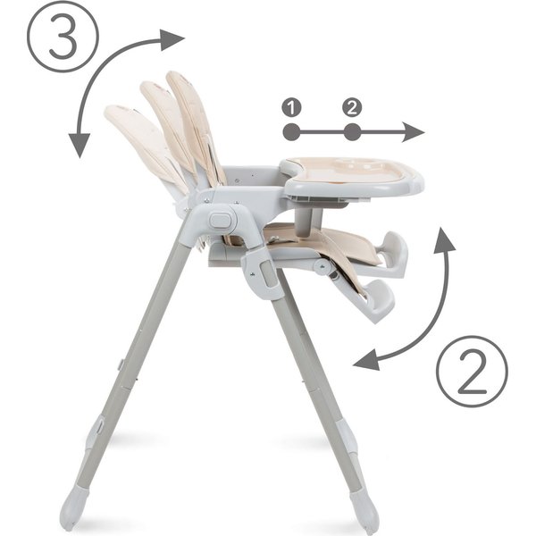 Krzesełko Beno posiada aż 6 - stopniową regulację wysokości, co pozwoli Ci na wygodne karmienie maluszka przy stole lub blacie kuchennym. Oparcie i podnóżek także posiadają regulację. W komplecie z krzesełkiem jest także taca z blatem z możliwością zdjęcia do czyszczenia. Możesz ją zamocować z tyłu krzesełka na specjalnie do tego przeznaczonym uchwycie.