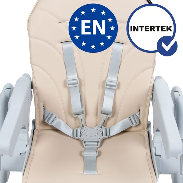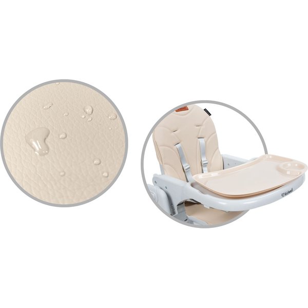 - materiał: metal (nogi), plastik (siedzisko i tacka), skóra ekologiczna (tapicerka)maksymalna waga dziecka: 15 kg