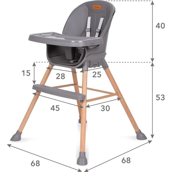 - materiał: drewno bukowe, polipropylen (nogi), plastik (siedzisko i tacka) , skóra ekologiczna (miękkie siedzisko)