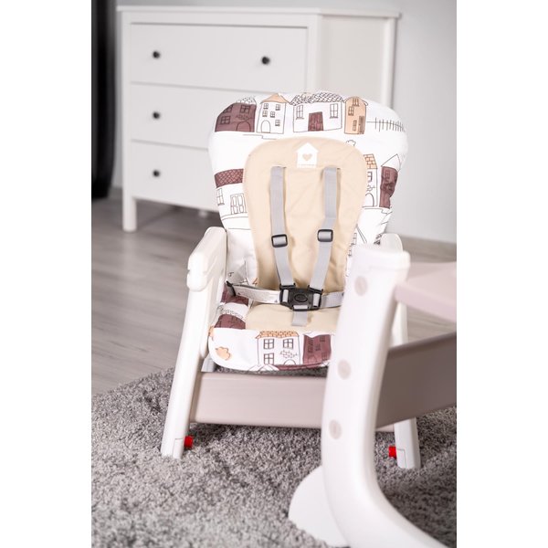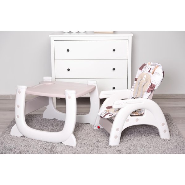 Krzesełko Homme może być klasycznym krzesełkiem do karmienia lub miejscem do zabawy lub samodzielnego spożywania posiłków. Wtedy rozkładamy je i mamy wygodny stoliczek oraz krzesełko. Krzesełko posiada regulowane nachylenie oparcia, dzięki czemu możemy dostosować je do dziecka. Bezpieczeństwo zapewniają 5-punktowe szelki oraz trzon pomiędzy nóżkami pod tacką.