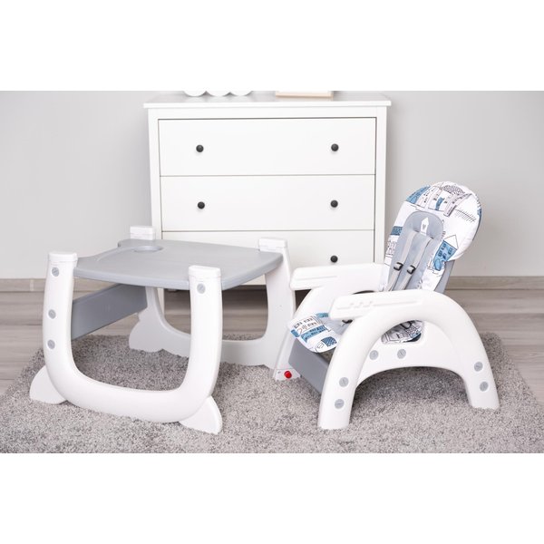 Krzesełko Homme może być klasycznym krzesełkiem do karmienia lub miejscem do zabawy lub samodzielnego spożywania posiłków. Wtedy rozkładamy je i mamy wygodny stoliczek oraz krzesełko. Krzesełko posiada regulowane nachylenie oparcia, dzięki czemu możemy dostosować je do dziecka. Bezpieczeństwo zapewniają 5-punktowe szelki oraz trzon pomiędzy nóżkami pod tacką.