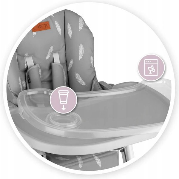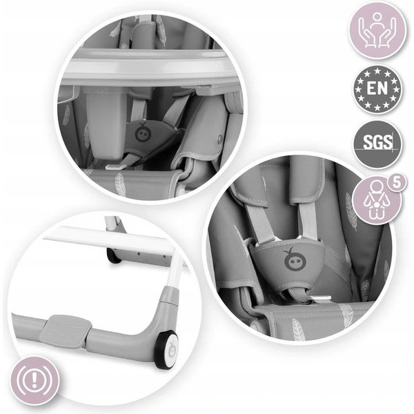 żka, które pozwolą przybrać wygodną, półleżącą pozycję. W chwilach gdy nie używamy tacki możemy ją bez problemu umieścić z tyłu krzesełka na specjalnym uchwycie. Prosty system rozkładania oraz możliwość złożenia go do kompaktowych wymiarów pozwala na jego przechowywanie lub transport.