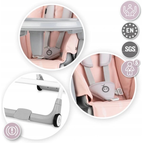Krzesełko do karmienia Luxuria od Momi to gwarancja zarówno wygody jak i bezpieczeństwa. Zapewnia maluszkowi doskonałe miejsce do spożywania posiłków, który będzie mógł zjeść razem z najbliższymi, przy stole. Wszystko dzięki 7 stopniowej regulacji wysokości, która pozwoli dostosować ją do naszych wymagań. Szeroko rozstawione kółka oraz stopki z antypoślizgiem, zapewniają odpowiednią stabilność. Nie ma, więc obaw, że krzesełko będzie się samoczynnie przemieszczać. Dodatkowo o bezpieczeństwo zadbają 5 punktowe pasy z możliwością regulacji. To pozwoli na idealne dopasowanie ich do wzrostu maluszka.