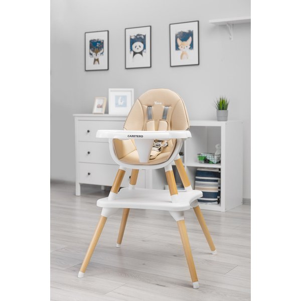 Krzesełko do karmienia Tuva od Caretero w modnym stylu skandynawskim. Jest to produkt 2w1, który pozwoli zaoszczędzić miejsce w domu. Ten fakt ucieszy szczególnie rodziców, którzy uwielbiają minimalizm. W jednej chwili z wysokiego krzesełka zamienimy go w dwa oddzielne produkty - krzesełko i stolik. Wykonany został z materiałów wysokiej jakości, co sprawia, że jest on zarówno trwały i bezpieczny podczas użytkowania. Wyposażony w 5 punktowe pasy i dodatkowe zabezpieczenie, chroni przed ewentualnym zsunięciu się maluszka i wypadnięciu z siedziska. Nie musimy się obawiać o jego stabilność ponieważ nogi zakończone są specjalnymi antypoślizgowymi nakładkami, które nie tylko chronią przed przesuwaniem się krzesełka, ale również zabezpieczają podłogę przed ewentualnymi zarysowaniami. Podwójna, regulowana tacka jest łatwa do wyczyszczenia i posiada dwa miejsca na kubek.