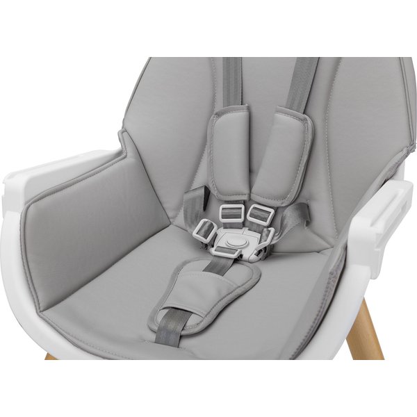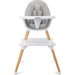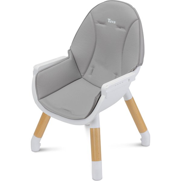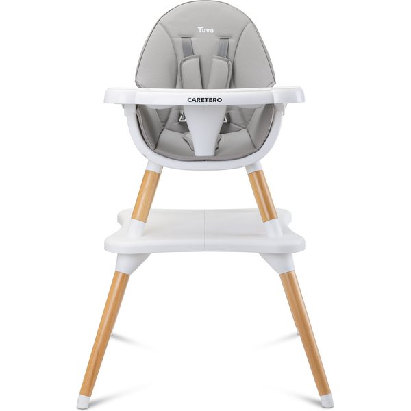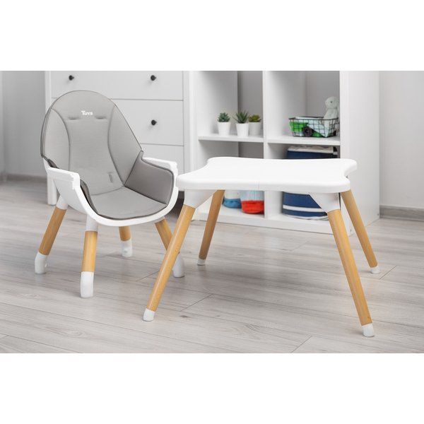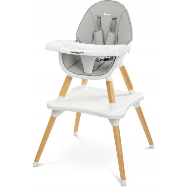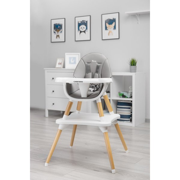 Krzesełko do karmienia Tuva od Caretero w modnym stylu skandynawskim. Jest to produkt 2w1, który pozwoli zaoszczędzić miejsce w domu. Ten fakt ucieszy szczególnie rodziców, którzy uwielbiają minimalizm. W jednej chwili z wysokiego krzesełka zamienimy go w dwa oddzielne produkty - krzesełko i stolik. Wykonany został z materiałów wysokiej jakości, co sprawia, że jest on zarówno trwały i bezpieczny podczas użytkowania. Wyposażony w 5 punktowe pasy i dodatkowe zabezpieczenie, chroni przed ewentualnym zsunięciu się maluszka i wypadnięciu z siedziska. Nie musimy się obawiać o jego stabilność ponieważ nogi zakończone są specjalnymi antypoślizgowymi nakładkami, które nie tylko chronią przed przesuwaniem się krzesełka, ale również zabezpieczają podłogę przed ewentualnymi zarysowaniami. Podwójna, regulowana tacka jest łatwa do wyczyszczenia i posiada dwa miejsca na kubek.