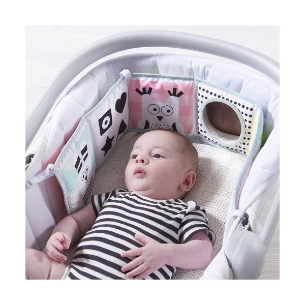 - mnogość atrakcji: szeleszczące elementy, zróżnicowane faktury, gryzaczek, lusterko oraz wesołe, kolorowe obrazki