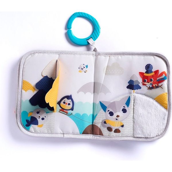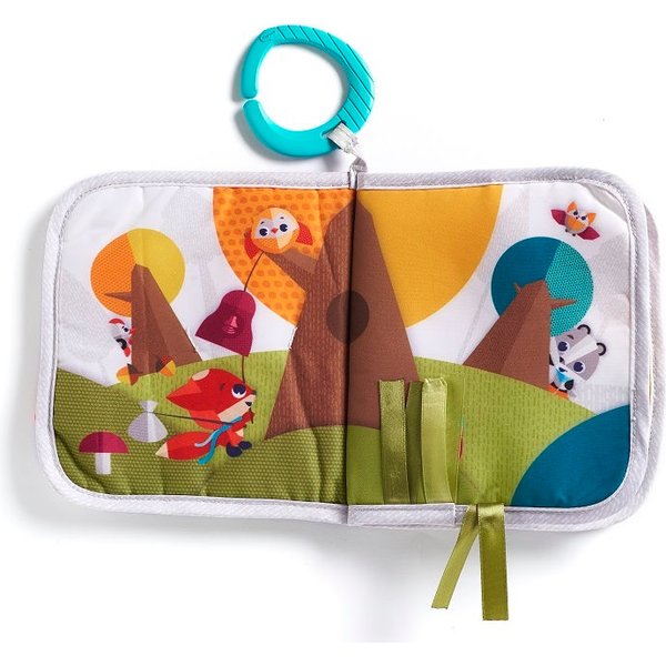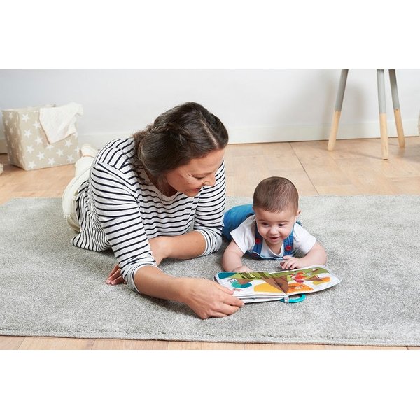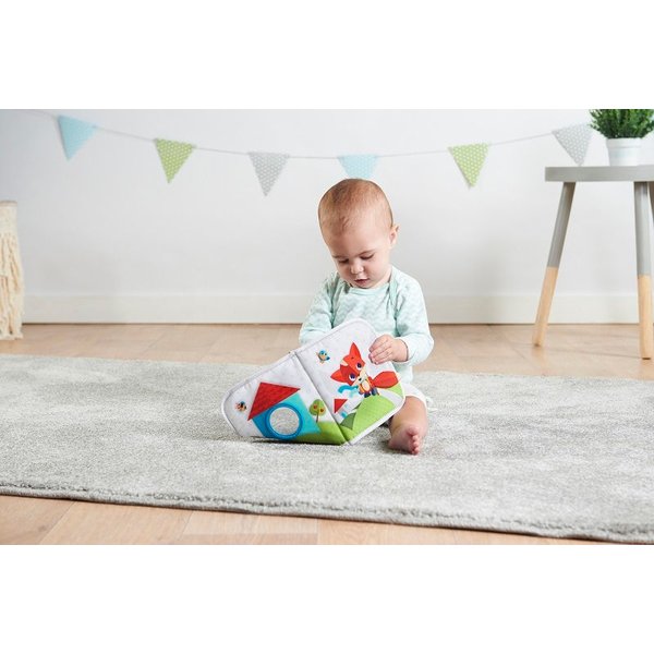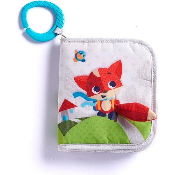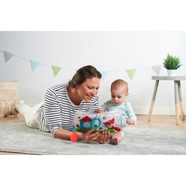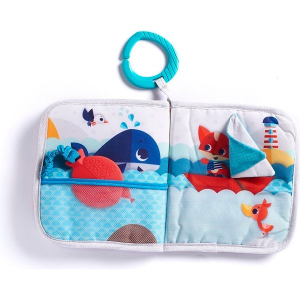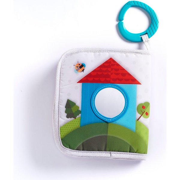 Miękka i kolorowa książeczka to pierwsza bajeczka dla maluszka. Strony książeczki wykonano z bezpiecznego, miękkiego materiału. Na książeczce zaczepiony jest elastyczny gryzaczek rybka na pasku, która razem z dzieckiem może odwiedzać każdą stronę i służyć jako zakładka. Zabawka pełna szeleszczących elementów, stymuluje zmysł wzroku i słuchu oraz rozwija umiejętności manualne. Książeczka również ma lusterko, w którym maluch będzie mógł poznać swoje odbicie. Zabawka posiada okrągły zaczep, który pozwala na zawieszenie w wózku, łóżeczku, na macie edukacyjnej czy foteliku samochodowym.