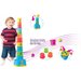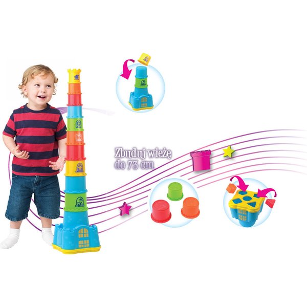 Dziecko ma do dyspozycji 11 elementów o różnej wielkości i kolorach, każdy oznaczony cyferką. Maluch może ułożyć z kubeczków wieżę, której wysokość to, aż 73 cm! Dzięki temu, że kubeczki są ponumerowane dziecko układa je po kolei i uczy się liczyć. Dodatkowo podstawa wieży ma kształt zamku, który może służyć jako pojemnik do przechowywania klocków. Nakładka na zamek ma otwory o różnych kształtach, dzięki czemu maluch może dopasowywać klocki kształtem.