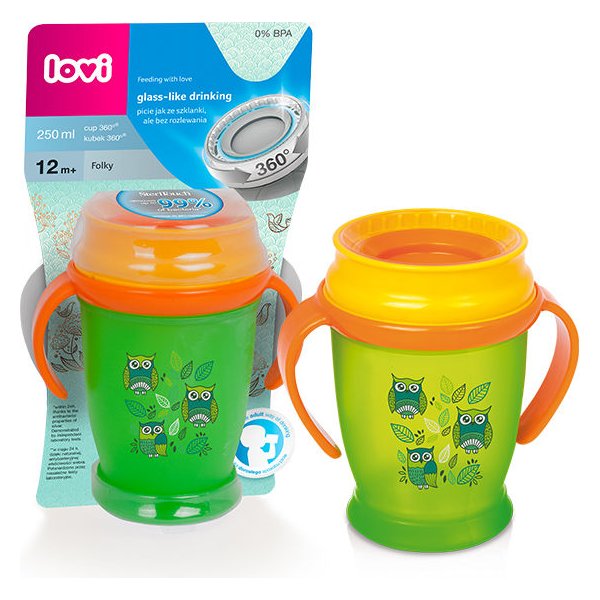 Kubek 360° marki Lovi do samodzielnego picia jak ze szklanki, bez rozlewania. Ułatwia przechodzenie od ssania płynu z kubka treningowego i kubka niekapka do picia ze szklanki. Dzięki innowacyjnemu systemowi uszczelniania przyzwyczaja dziecko do naturalnego sposobu picia (jak z otwartego kubka), ale bez rozlewania. Posiada opatentowaną ochronę przed bakteriami SteriTouch®