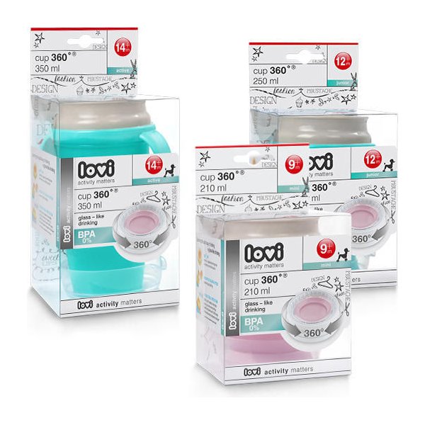Kubek 360° marki Lovi do samodzielnego picia jak ze szklanki, bez rozlewania. Ułatwia przechodzenie od ssania płynu z kubka treningowego i kubka niekapka do picia ze szklanki. Dzięki innowacyjnemu systemowi uszczelniania przyzwyczaja dziecko do naturalnego sposobu picia (jak z otwartego kubka), ale bez rozlewania. Posiada opatentowaną ochronę przed bakteriami SteriTouch®