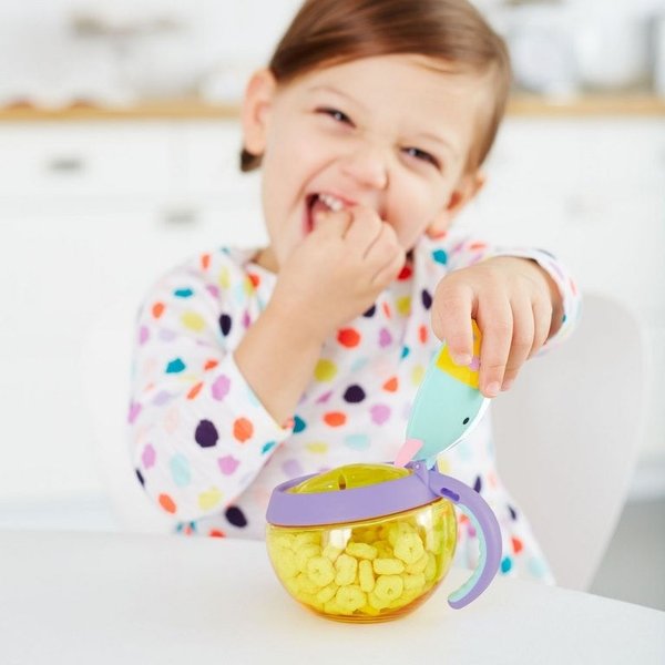 Przydatny pojemnik na przekąski, doskonały do wykorzystania zarówno w domku, ja i na spacerze, czy podczas podróży samochodem. Pojemniczek ma miękką przykrywkę umożliwiającą małym rączkom dostęp do środka oraz łatwy do trzymania uchwyt. Gdy pojemniczek przewrócimy do góry nogami, przekąski pozostają w środku. Antypoślizgowe uchwyty ułatwiają trzymanie i przenoszenie przez dziecko. Sprawdzi się przy podawaniu różnych przekąsek, chrupek, owoców i warzyw.