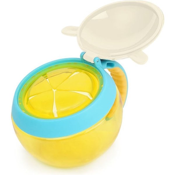 Przydatny pojemnik na przekąski, doskonały do wykorzystania zarówno w domku, na spacerze, czy podczas podróży samochodem. Pojemniczek ma miękką przykrywkę umożliwiającą małym rączkom dostęp do środka oraz łatwy do trzymania uchwyt. Gdy pojemniczek przewrócimy do góry nogami, przekąski pozostają w środku. Antypoślizgowe uchwyty ułatwiają trzymanie i przenoszenie przez dziecko. Sprawdzi się przy podawaniu różnych przekąsek, chrupek, owoców i warzyw.