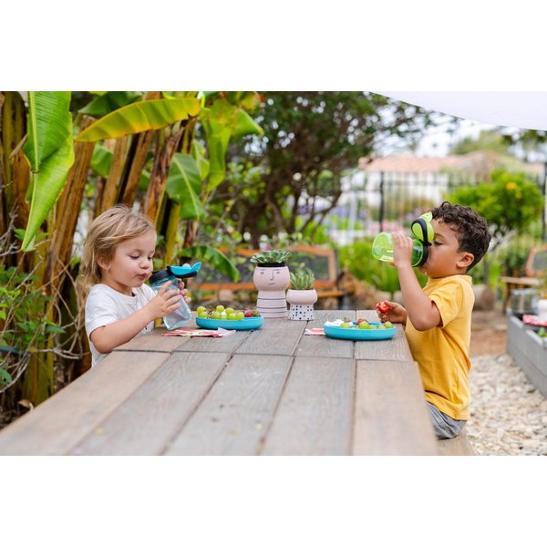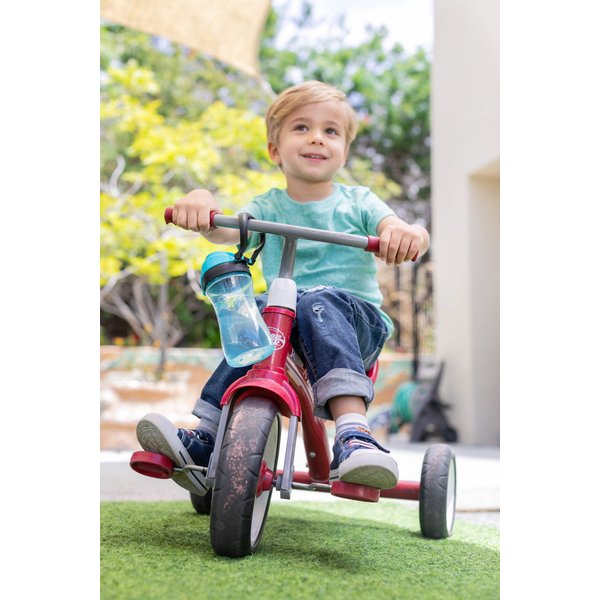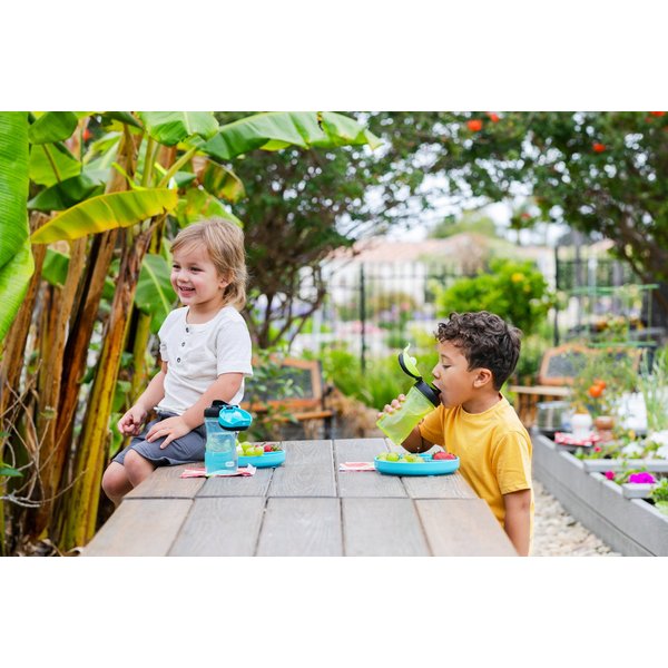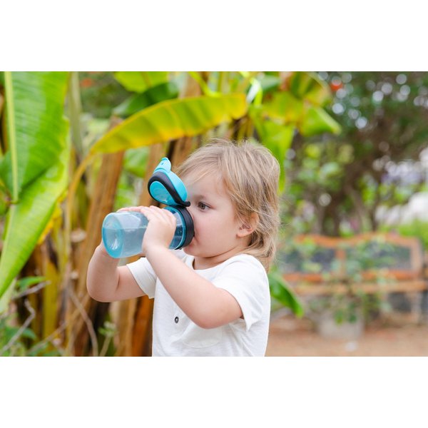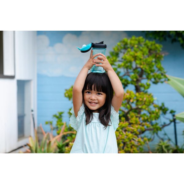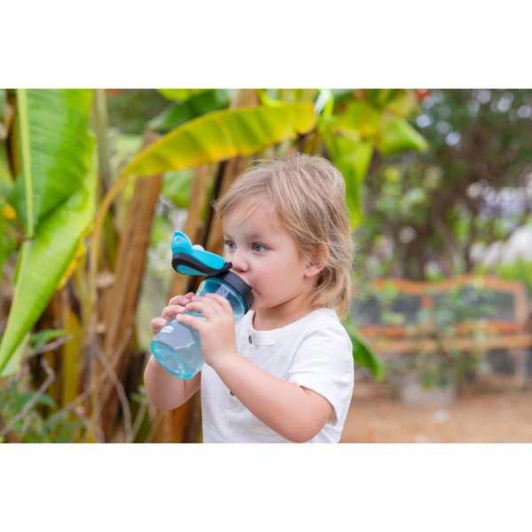 Bidon posiada twardy ustnik z dużą pokrywą zapobiegającą jego zabrudzeniu. Napój swobodnie wypływa z ustnika, który posiada kształt ułatwiający picie. Szczelność bidonu jest gwarantowana przy zamkniętej pokrywce. Dzięki ergonomicznemu kształtowi butelki i obecności dużego uchwytu bidon może być łatwo przenoszony przez dzieci. Ten model charakteryzuje się stonowaną kolorystyką i brakiem ozdób, co spodoba się starszym dzieciom. Transparentny korpus butelki pozwala na szybkie sprawdzenie, ile pozostało napoju.