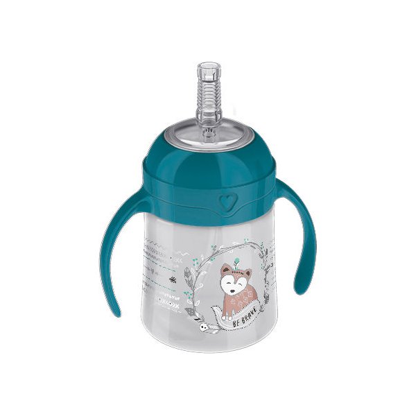 Model ten idealnie sprawdzi się w przypadku półrocznych dzieci, które mają teraz za zadanie opanowanie trudnej sztuki picia z naczyń innych niż zwykła butelka ze smoczkiem. Kubek posiada kolorową grafikę, która spodoba się każdemu maluszkowi. Posiada on delikatną dla wrażliwych dziąseł silikonową słomkę, odpowiednio giętką i łatwą do złapania ustami. Słomka została wyposażona w odważnik podążający za nią niezależnie od pozycji, w której znajduje się butelka, aby umożliwić wydajne picie. Kubek posiada wygodne do trzymania uchwyty, zachęcające do nauki samodzielnego picia.