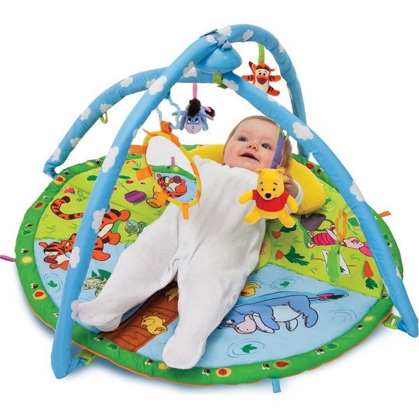 Na macie maluch odkryje mnóstwo nowych niespodzianek, zabawek, dźwięków oraz faktur. Na pałąku wiszą kolorowe zabawki, które bujają się przy każdym potrąceniu pałąków. Wśród tych zabawek znajdziemy 3 pluszaki: Puchatka, Kłapouchego, Tygryska, lustereczko, gryzaczek, grzechotkę.
