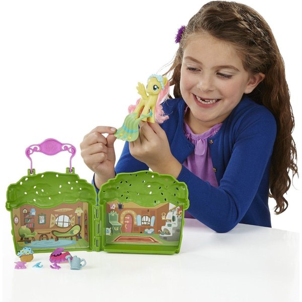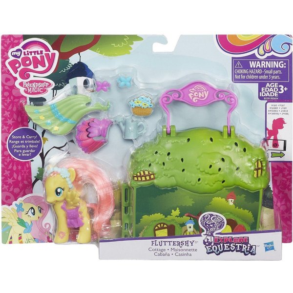 Kucyk Fluttershy lubi przebywać w swoim przytulnym domku. Pomóż jej zadbać o piękny ogród, a później ozdób kucyka za pomocą dołączonych akcesoriów!