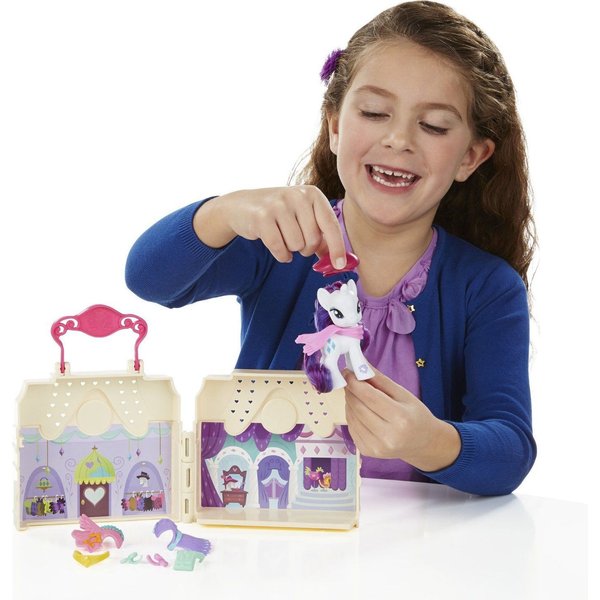 Kucyk Rarity prowadzi modny butik z ubrankami. Pomóż jej zadbać o klientów, a później ozdób kucyka za pomocą dołączonych akcesoriów!