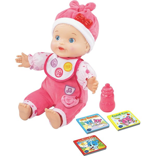 Lalka ma w zestawie buteleczkę, smoczek oraz 3 książeczki.