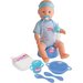 Mały bobasek ubrany jest w kolorowe śpioszki oraz opaskę - wygląda uroczo! W zestawie znajduje się wiele akcesoriów do opieki. Jest tu smoczek uspokajający, miseczka oraz sztućce, butelka do karmienia, kubeczek, pampers, a nawet nocniczek.