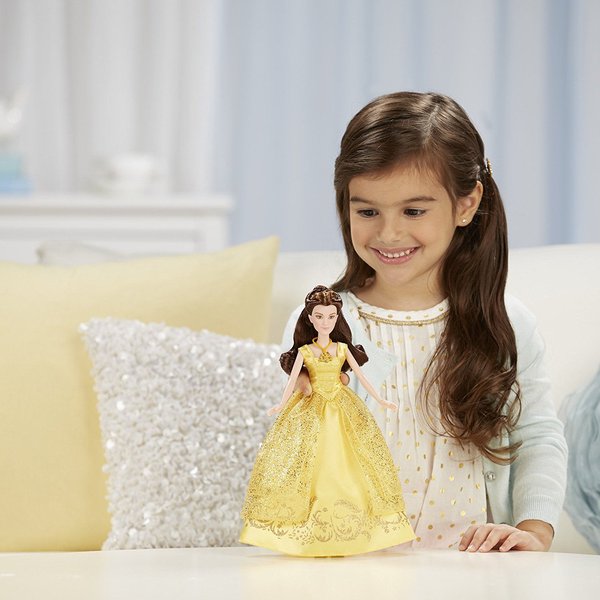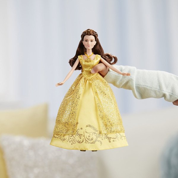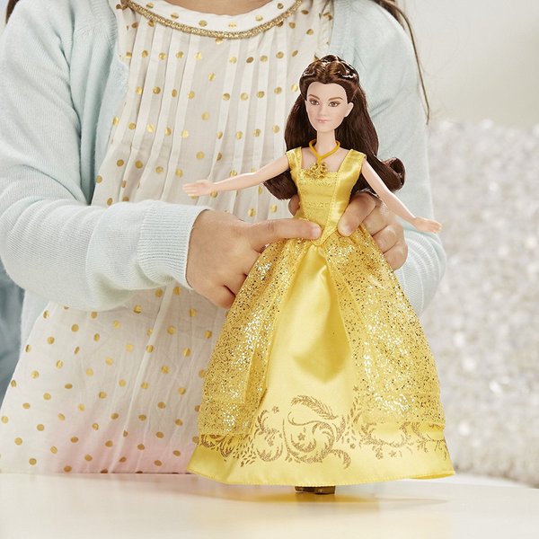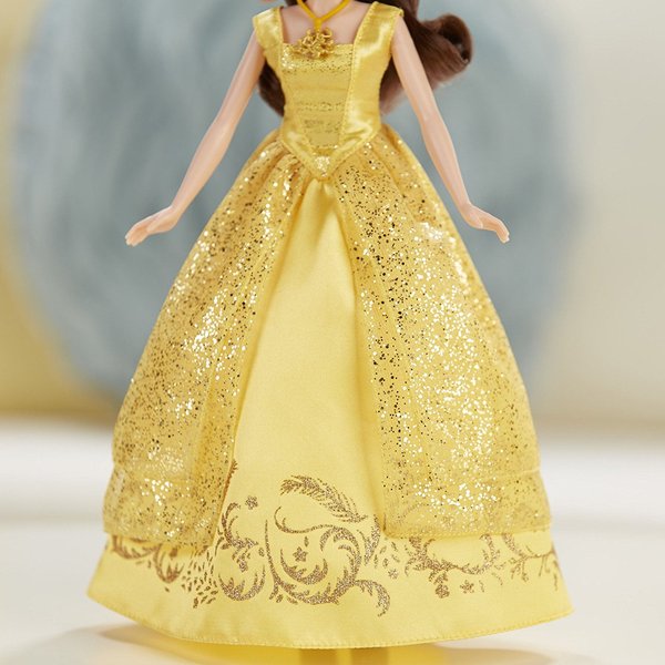 Lalka przedstawia wizerunek Belli w pięknej sukni balowej - wygląda dokładnie jak w baśni!