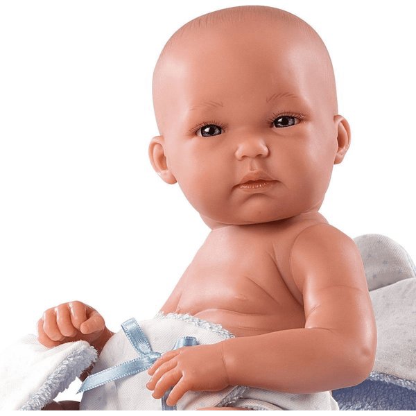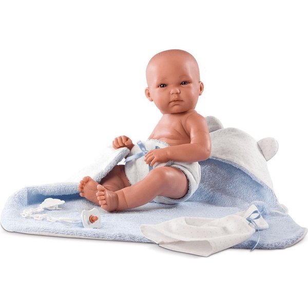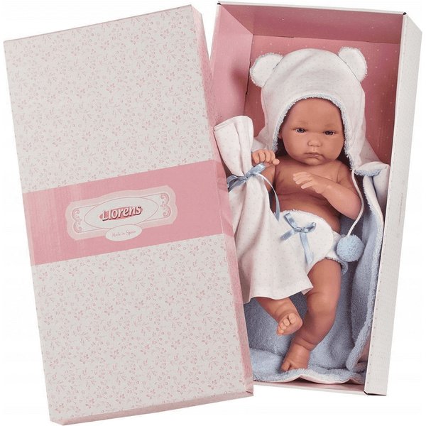 Ta mała laleczka swoim wyglądem przypomina prawdziwe niemowlę. Ten słodki bobas wykonany jest z winylu, który jest bardzo miły w dotyku i sprawia, że można się z nią kąpać. Zarówno główka jak i kończyny poruszają się w okół własnej osi. Dodatkowo lalka posiada pieluszkę, smoczek, niebieski szlafroczek kąpielowy z kapturkiem i ręcznik. Oczy lalki nie zamykają się. Można ją Opakowana jest w ozdobne pudełko, które nadaje się na prezent.