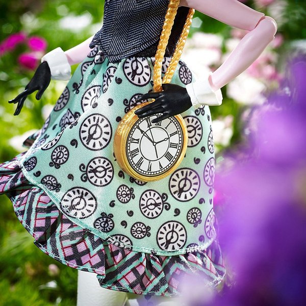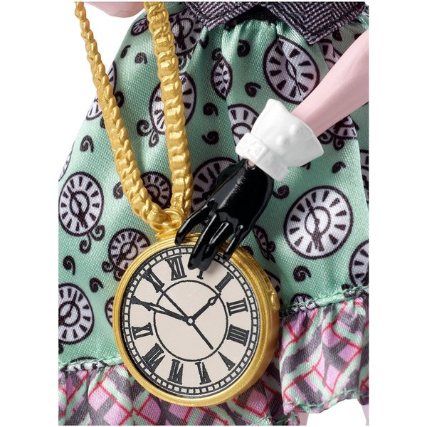 Bunny Blanc w pięknym turkusowo-czarnym stroju zdobionym małymi zegareczkami i futerkiem. Na głowie ma opaskę z uszkami króliczka i ślicznym kapeluszem. W zestawie akcesoria szczotka do włosów i torebka.