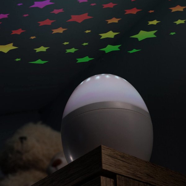 Lampka nocna pomoże twojemu maluszkowi spokojnie zasnąć. Wyświetlane na suficie konstelacje gwiazd z pewnością zaciekawią dziecko, a co najważniejsze uspokoją go przed snem. Kolejną ciekawą funkcją tego urządzenia jest wybór koloru wyświetlanych gwiazd na suficie - jest ich aż 4 (czerwony, żółty, zielony niebieski). Dodatkowo urządzenie posłuży jako klasyczna lampka nocna. Lampka jest przenośna, możemy postawić ją przy łóżeczku dziecka. Obsługa jest bardzo prosta i intuicyjna.