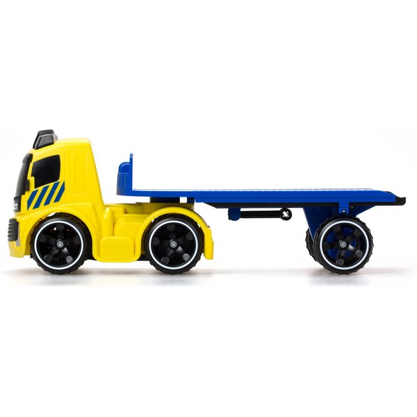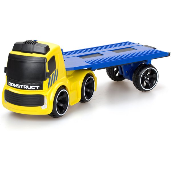 Maluch może sterować lawetą za pomocą pilota. Na budowie zawsze dużo się dzieje. Niech Twoja pociecha wciśnie przyciski aktywujące dźwięki, aby zabawa była jeszcze bardziej realistyczna. Buldożer - spychacz z ruchomymi kołami jest łatwy do prowadzenia za pomocą ręki po podłodze Duża laweta, z rozsuwaną rampą, jeździ we wszystkich kierunkach, a steruje się nią za pomocą dołączonego do zestawu pilota. Znajdują się na nim także specjalne przyciski, aktywujące realistyczne odgłosy, które pozwolą maluchom poczuć się jak na prawdziwym placu budowy. Drugi pojazd, spychacz, posiada ruchome koła, dzięki czemu można się nim bawić, prowadząc go ręką po podłodze. Taka zabawa to znakomita okazja do tego, aby dziecko ćwiczyło zdolności manualne, wyobraźnię przestrzenną i koordynację ręka - oko.