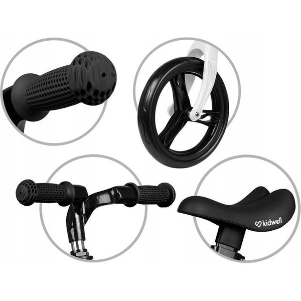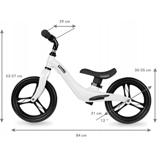 Jeszcze lżejszy rowerek od firmy Kidwell! Model Force waży tylko 2,56 kg! Jest skonstruowany z jednoczęściowej, niespawanej ramy, która gwarantuje bezpieczne wykończenie. Firma Kidwell projektuje swoje produkty tak, aby były w pełni bezpieczne. Podczas upadku kierownica pod ciężarem dziecka złoży się na płasko, co zmniejsza ryzyko urazu. Posiada gumowe rączki z antypoślizgiem, które zakończone są zabezpieczeniem przed otarciami. 12 calowe opony wykonane są z pianki EVA. Siodełko oraz w pełni skrętna kierownica posiadają regulację wysokości. Dzięki czemu możemy rowerek dopasować do dziecka.