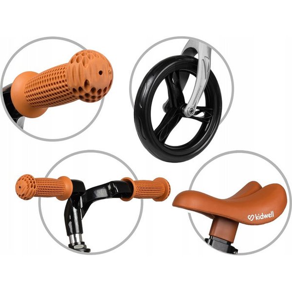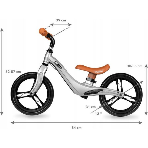Jeszcze lżejszy rowerek od firmy Kidwell! Model Force waży tylko 2,56 kg! Jest skonstruowany z jednoczęściowej, niespawanej ramy, która gwarantuje bezpieczne wykończenie. Firma Kidwell projektuje swoje produkty tak, aby były w pełni bezpieczne. Podczas upadku kierownica pod ciężarem dziecka złoży się na płasko co zmniejsza ryzyko urazu. Posiada gumowe rączki z antypoślizgiem, które zakończone są zabezpieczeniem przed otarciami. 12 calowe opony wykonane są z pianki EVA. Siodełko oraz w pełni skrętna kierownica posiadają regulację wysokości. Dzięki czemu możemy rowerek dopasować do dziecka.