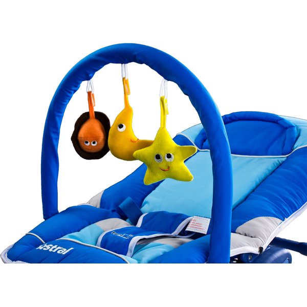 Praktyczny leżaczek z funkcją bujania, niezastąpiony podczas codziennej opieki nad dzieckiem. Wygodne, regulowane siedzisko i oparcie oraz absorbujące zabawki na pałąku odpowiadają za komfortowy odpoczynek dziecka, w trakcie którego rodzice mają czas dla siebie.