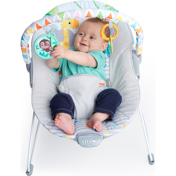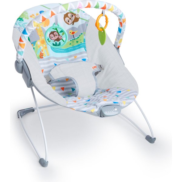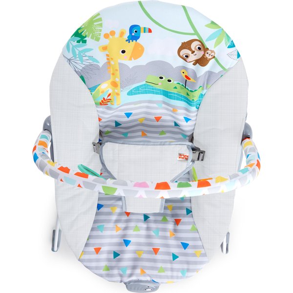 Leżaczek z delikatnymi wibracjami pozwoli dziecku w pełni zrelaksować się podczas odpoczynku. Posiada pałąk z dwiema zabawkami, które można wymieniać na inne zawieszki firmy Bright Starts. Zabawa nimi sprawi, że maluch będzie rozwijał swoje umiejętności manualne oraz pobudzi swój zmysł wzroku i dotyku. Pałąk jest łatwy w demontażu, a lekka konstrukcja leżaczka sprawia, że jest on łatwy w transportowaniu z jednego pokoju do drugiego. Leżaczek jest również bezpieczny dzięki 3-punktowym pasom i antypoślizgowym nóżkom. Materiał siedziska można z łatwością zdemontować i wyprać. Maluch chętnie będzie relaksował się w leżaczku w ciągu dnia, dając chwilę wytchnienia swoim opiekunom.