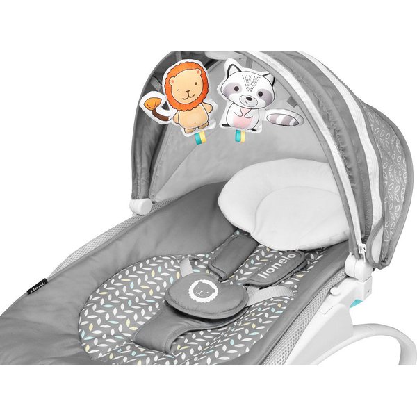 Leżaczek Henk od firmy Lionelo ze ściąganym daszkiem, chroni dziecko przed intensywnym światłem. Posiada delikatne wibracje, regulowane w 2 stopniach, które ułatwią mu zrelaksowanie się. Dodatkowo ma możliwość odtwarzania melodii co ukołysze maluszka do snu. Głośność dźwięków również jest regulowana. Bujaczek wyposażony jest też w pałąk na którym zawieszone są dwie interaktywne zabawki. Gdy się je dotknie, zaczną wydawać dźwięki. Pałąk wzbogacony jest o diody, które świecą w różnych kolorach. Są wyposażone w 2 tryby: wyświetlanie ciągłe lub migotanie wszystkich świateł. Bezpieczeństwo zapewniają 5-punktowe pasy. Oparcie regulowane jest w 2 pozycjach - do spania i zabawy.