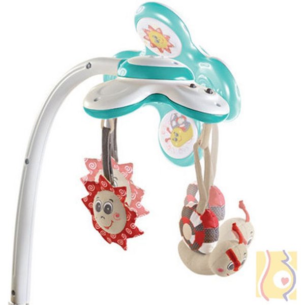 Atrakcyjnym dla dziecka elementem leżaczka jest zabawka świetlno-muzyczna na ruchomym ramieniu, która może zostać aktywowana przez dziecko. Zabawka posiada 7 melodii oraz dwa stopnie głośności. Dźwięk można ustawić w 3 trybach pracy: jako muzykę ciągłą zabawną lub kojącą oraz muzykę aktywowaną przez malucha której uruchomienie następuje, gdy malec chwyci jedną z wiszących zabawek.