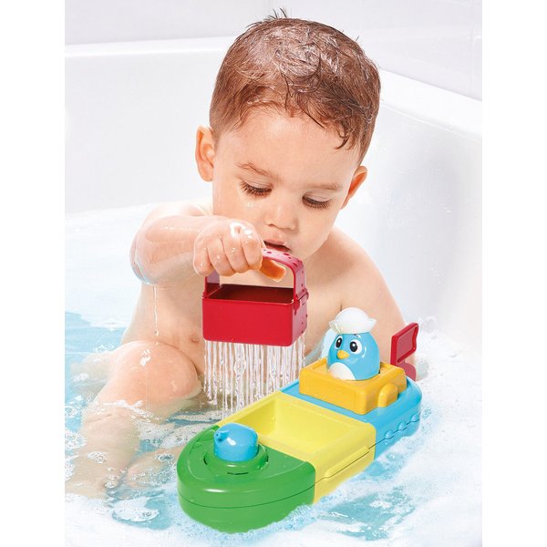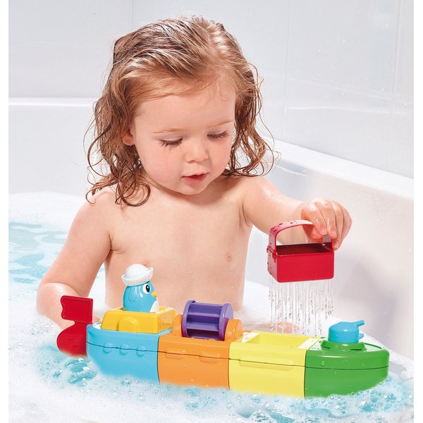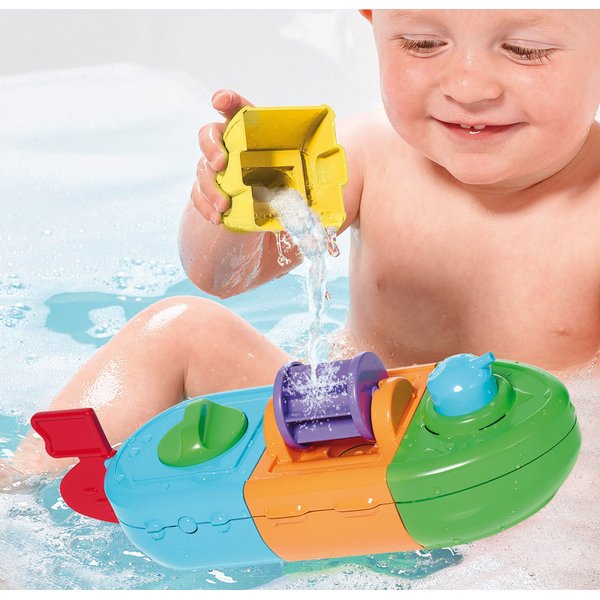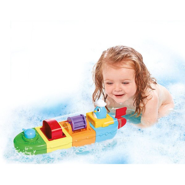 Woda będzie tryskać, gdy maluch naciśnie na peryskop, wlana na turbinę wprawi ją w ruch rozpryskując strugi dookoła! Jest tu też sitko, dzięki któremu maluch będzie mógł nabierać i przelewać wodę. Dodatkowo łódka posiada napęd, wystarczy nakręcić pojazd, wcisnąć przycisk, a łódka ruszy przed siebie. Maluch może też łączyć części statku według własnego pomysłu, tworząc przy tym codziennie inne pojazdy do zabawy!
