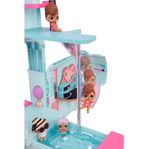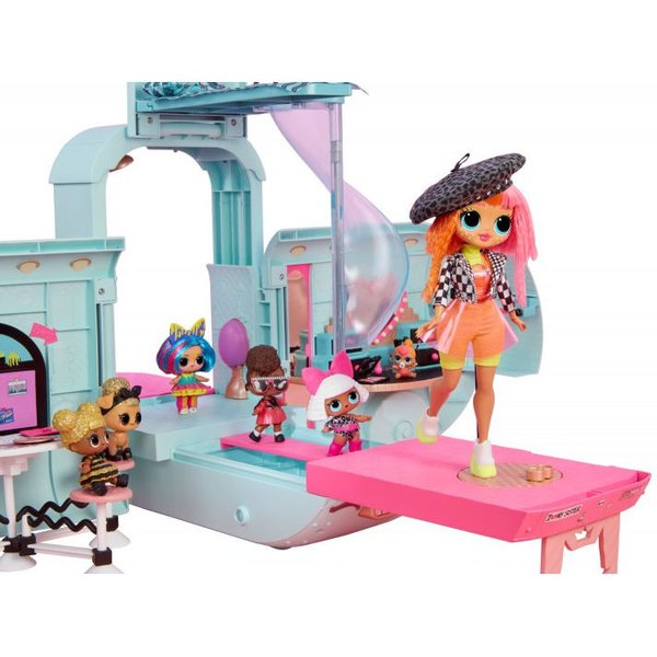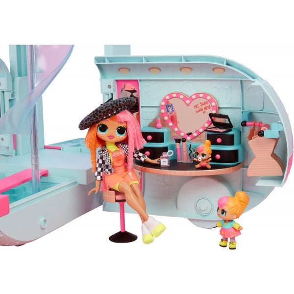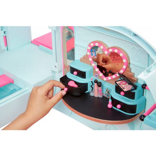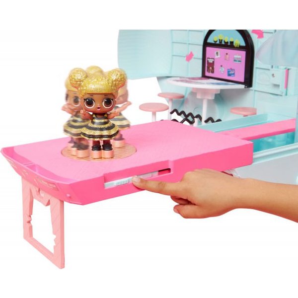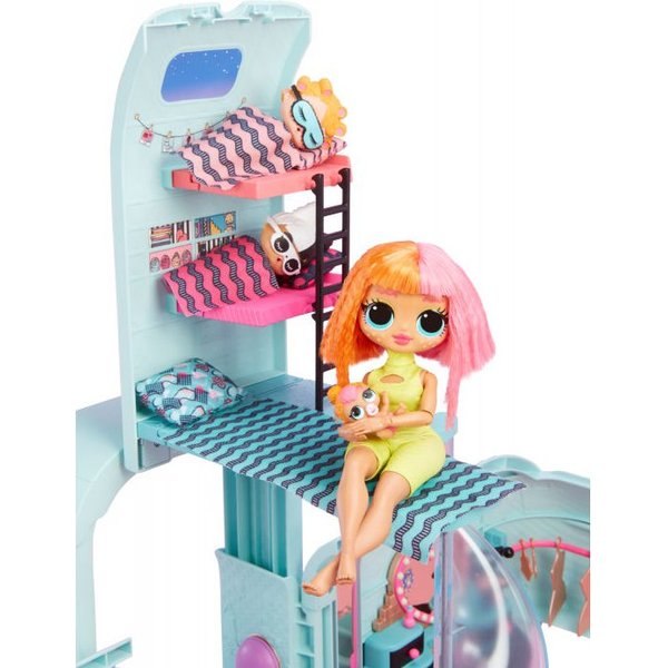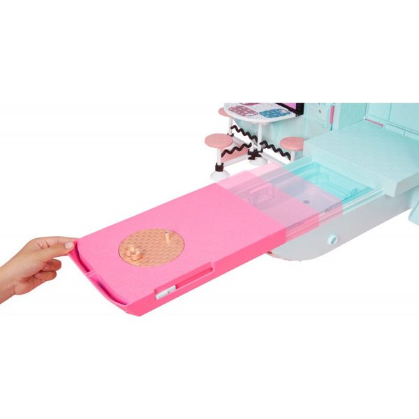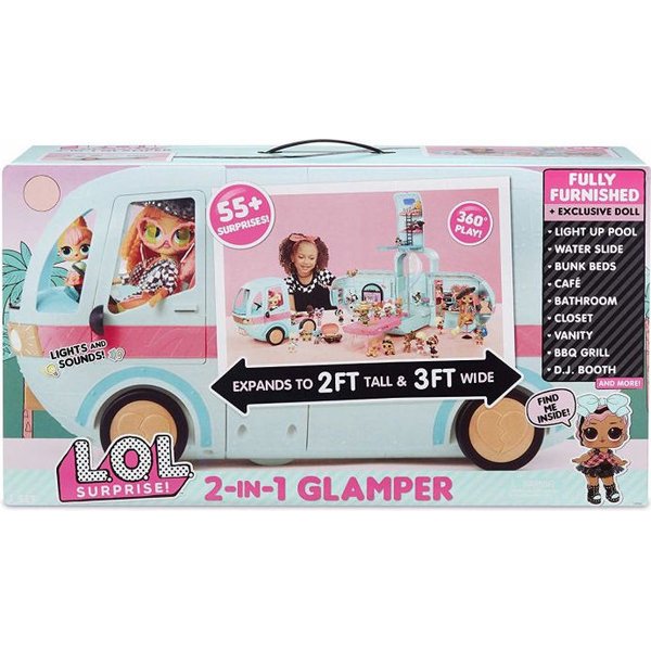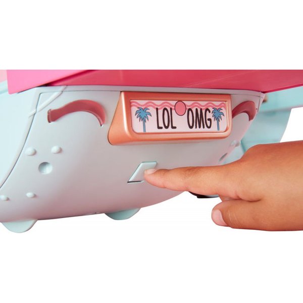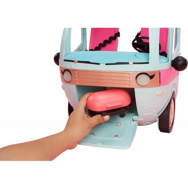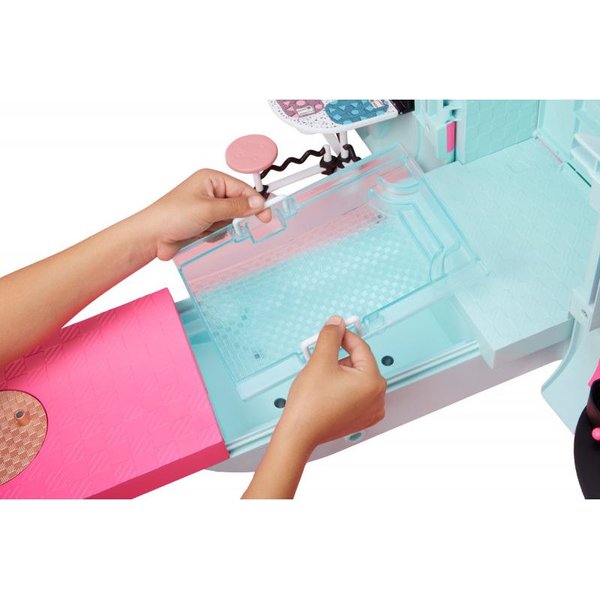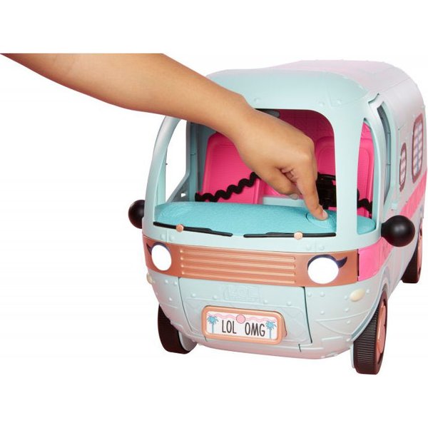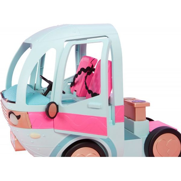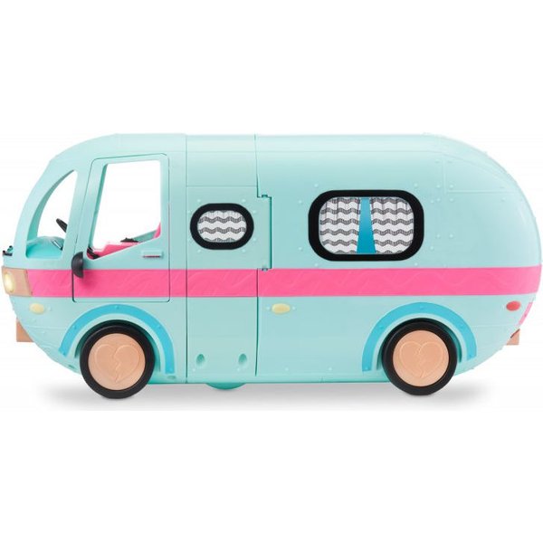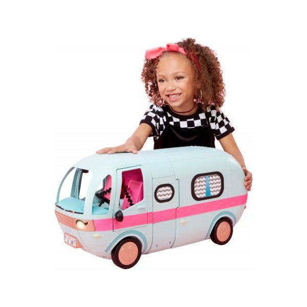 Wesoły camper L.O.L. Surprise to jeszcze więcej niespodzianek do odkrycia! Posiada on ponad 55 niespodzianek ukrytych po całym Camperze. Pojazd jest rozkładany, wewnątrz znajdują się meble i dodatki takie jak: fotel, miejsce na postawienie napoi, konsola dla DJ, grill, piętrowe łóżko, kącik piękności, tv, miejsce na basen, wybieg i wiele innych. Takiej ilości niespodzianek nikt się nie spodziewał! Wyrusz w niezapomnianą przygodę dokąd tylko zapragniesz z wspaniałym Camperem!