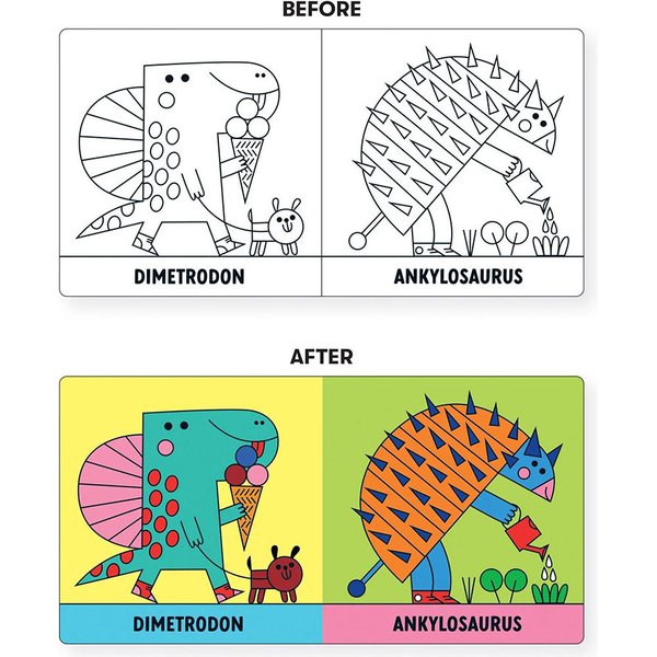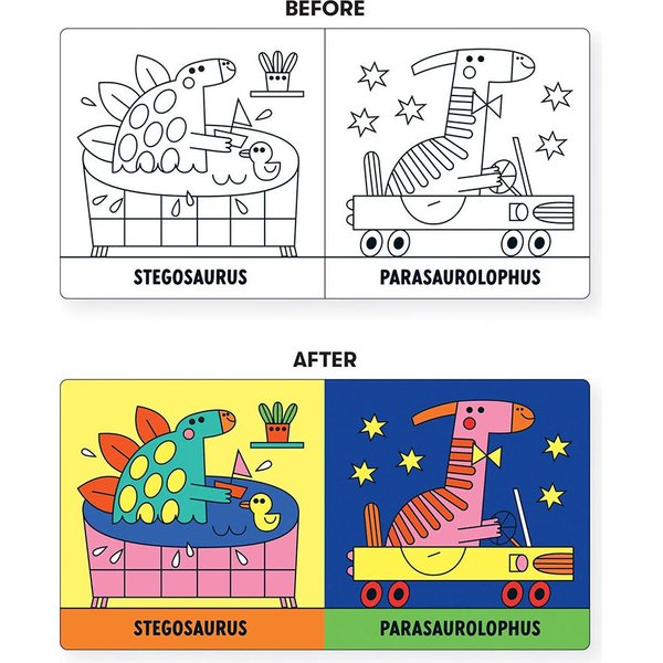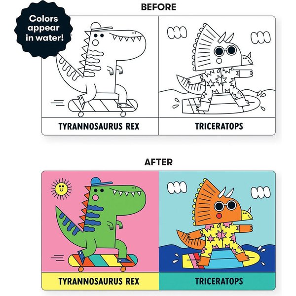 Model książeczki dla niemowląt został wykonany z odpornych na działanie wody materiałów, abyś bez obaw mógł go zanurzyć w wodzie. Czarno - białe obrazki dinozaurów staną się wówczas kolorowe. Maluch podczas kąpieli może ćwiczyć prawidłowy chwyt, obserwować poszczególne kolory i kształty oraz ćwiczyć zdolność skupiania wzroku i rozumienia związków przyczynowo - skutkowych. Kolorowe ilustracje zaprojektowała hiszpańska artystka Teresa Bellon. Książeczka to doskonały pomysł na prezent.