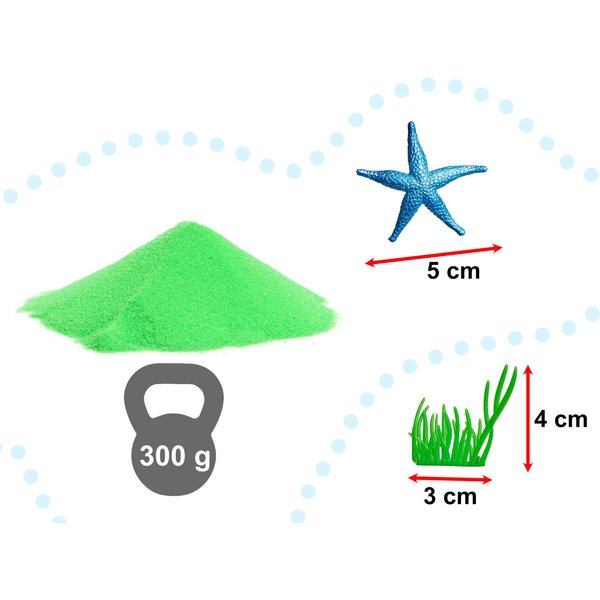 Niezwykły proszek, przypominający z wyglądu zielony piasek ujawnia swe właściwości pod wodą. Pozwól swojemu maluszkowi wykorzystać jakieś szklane naczynie do własnoręcznego stworzenia morskiego świata z rybkami, foczką i rozgwiazdą. Po wsypaniu magicznego proszku do wody maluch może tworzyć z bardzo plastycznej masy niezwykłe, podwodne konstrukcje - zamki, jaskinie i domki dla morskich stworzeń. Po wyciągnięciu z wody proszek będzie suchy, a jego magia znowu będzie tajemnicą! Wspaniała, niezwykle kreatywna zabawa, rozwijająca zdolności manualne bez uciążliwego brudzenia i plam, odpowiednia w czasie złej pogody, kiedy dziecku dokucza nuda.