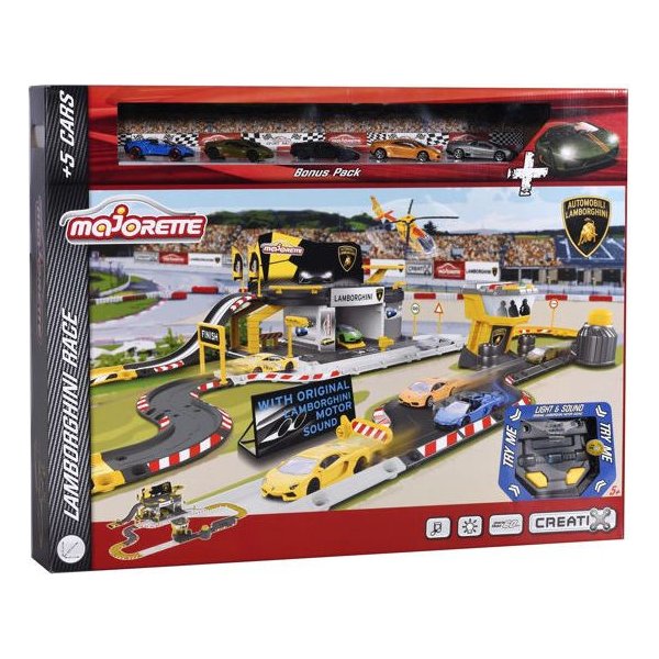 Tor wyścigowy Lamborghini będzie świetnym prezentem dla małego rajdowca. Zestaw składa się z rozbudowanego toru oraz 5 licencjonowanych autek Lamborghini. Dodatkowo tor wyposażony jest w efekty świetlne oraz dźwiękowe co daje dodatkowe atrakcje podczas zabawy. Tor można łączyć z pozostałymi zabawkami z serii Creatix.
