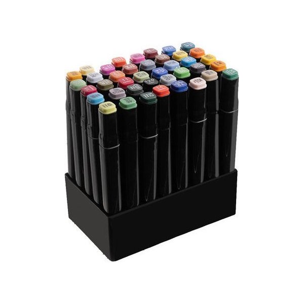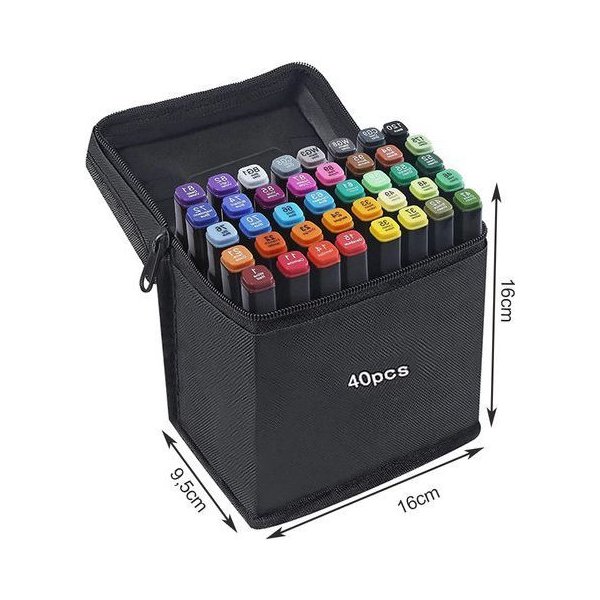 Komplet dwustronnych pisaków to aż 40 przeróżnych kolorów, które dają wiele możliwości. Z pewnością ich zaleta jest fakt, że są one dwustronne. Posiadają końcówkę okrągłą do rysowania czy pisania oraz skośną do zakreślania. Mazaki są bardzo wydajne i starczą na dłuższy czas. Do zestawu dołączone zostało etui, które stanowić będzie doskonałe miejsce do przechowywania, jednocześnie zapewniając porządek i dobrą organizację.
