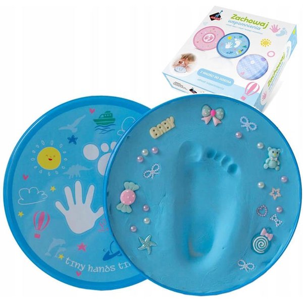 Elastyczna masa do stworzenia odcisku stópki lub rączek. Pozwoli to zatrzymać wspomnienia i przemijający czas, na dłużej. Nie jest to masa szybkoschnąca, dzięki czemu możemy tworzyć odcisk wielokrotnie, aż do momentu w którym uzyskamy zadowalający efekt. Dodatkowo w zestawie znajdują się elementy do zdobienia odcisku (perełki, małe plastikowe elementy). Całość zapakowana jest w metalowe pudełko, które ochroni masę oraz będzie stanowiła doskonałą ozdobę pokoju.
