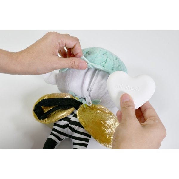 Maskotka od Miniland z ukrytą pozytywką, która dodaje je zalet! Jednak to nie taka zwykła pozytywka. Daje ona możliwość nagrywania piosenek lub opowieści, dzięki czemu maluch może słuchać głosu swoich rodziców. W połączeniu z czujnikiem płaczu pozwoli uspokoić dziecko gdy tylko się przebudzi. Oprócz tego posiada 5 relaksujących dźwięków. Pozytywka może pracować w trybie normalnym lub czuwającym. Posiada ona również automatyczne wyłączenie po 20 minutach. Praktyczne zapięcie na rzep ułatwi przymocowanie jej w kojcu, wózku czy łóżeczku. Po wyciągnięciu głośnika można ją wyprać lub posłuży nam jako maskotka dla maluszka.
