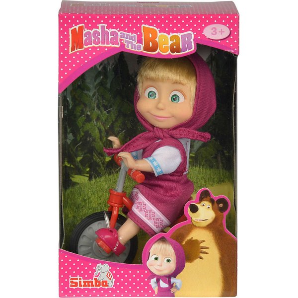 Laleczka ubrana jest fioletową sukienkę oraz białą bluzeczkę. Głowę zdobi chusta pod kolor sukienki - wygląda dokładnie jak w bajce! W zestawie także trójkołowy rowerek dla Maszy.