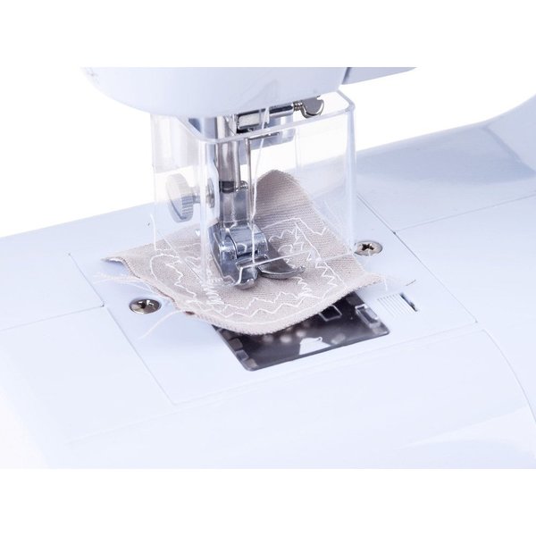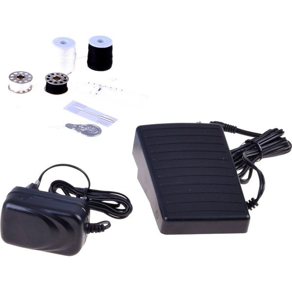- maszyna do szycia z pedałem, nawlekaczem nici, regulacją stopki, osłonką igły i uchwytem do przenoszenia