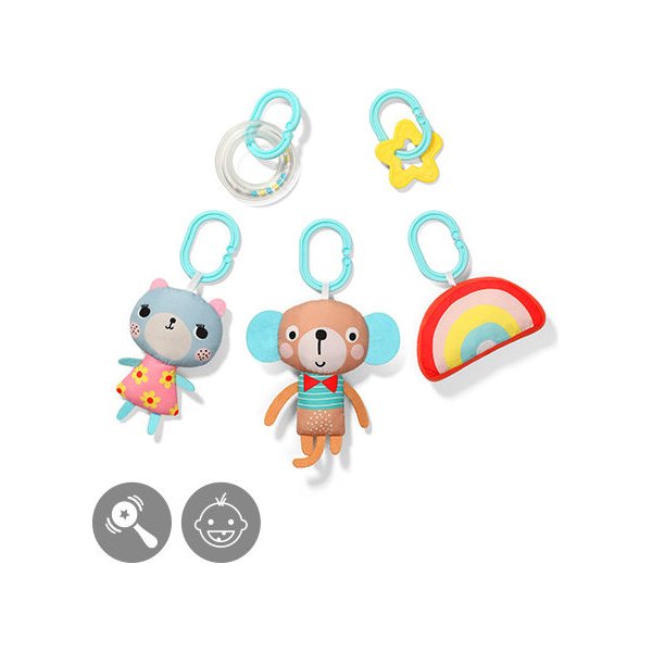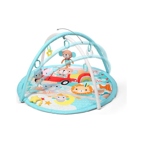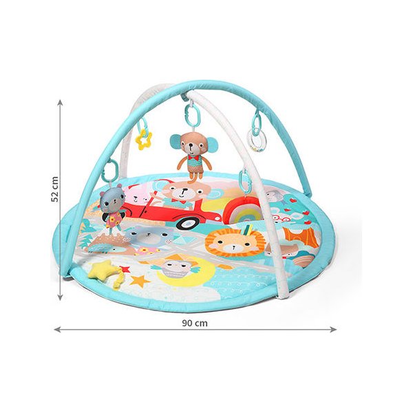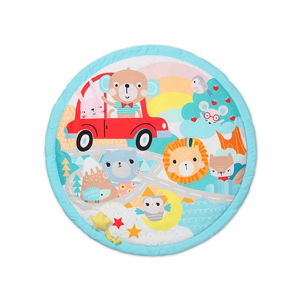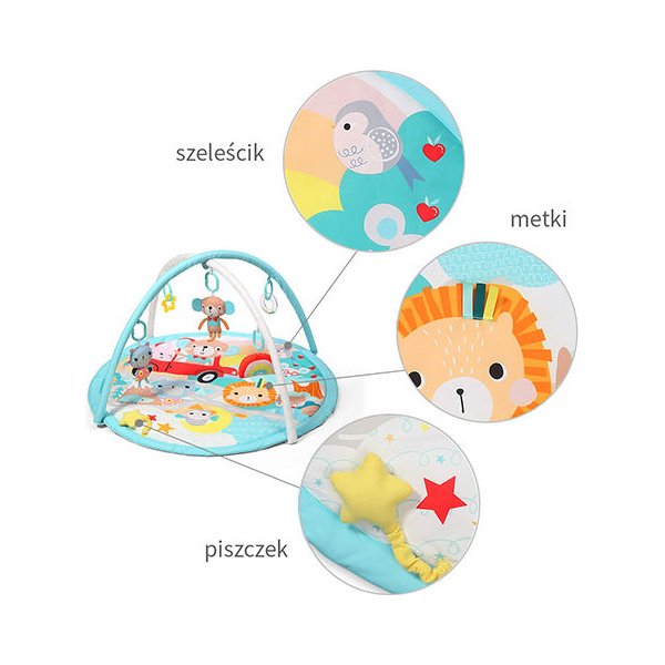 Mata posiada wystające metki, szeleścik i piszczek, przyciągające uwagę maluszka. Do dyspozycji małego odkrywcy są jeszcze odczepiane zabawki: piszczek, gryzak pomocny przy ząbkowaniu, szeleścik oraz 2 grzechotki. Pomogą one w ćwiczeniu prawidłowego chwytu, słuchu oraz koordynacji ruchowej. Sensoryczna zabawa gwarantowana! Urocza scenka ze zwierzątkami kąpiącymi się w basenie to dużo pole do popisu dla dziecięcej wyobraźni i znakomita okazja do opowiadania historyjek.