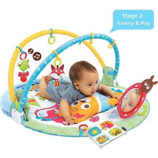 Etap 2 - mata edukacyjna zapewni dużo miejsca do ćwiczeń mięśni szyi i ramion. Wystarczy położyć maluszka na brzuchu, a zabawki zachęcą do jak najdłuższego utrzymania główki oraz do jej odwracania, a w dalszym etapie chwytania ich w tej pozycji.