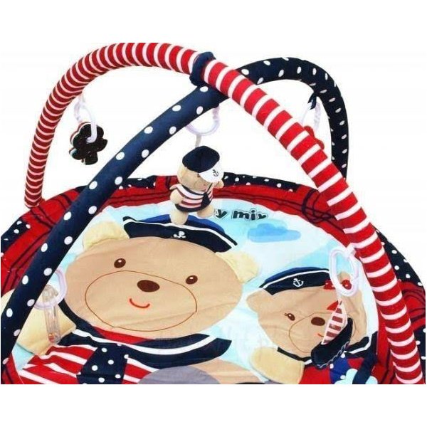 Mata oprócz pięknych barw, które na pewno przykują wzrok maluszka, posiada również dwa pałąki. Znajdują się na nich zabawki tematyczne, które posiadają grzechotkę. Pałąki można odczepić, a wtedy dla starszego malucha powstanie mata na której może spędzać czas. Również zabawki są odpinane, więc można je zabrać ze sobą do wózka czy auta.