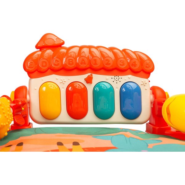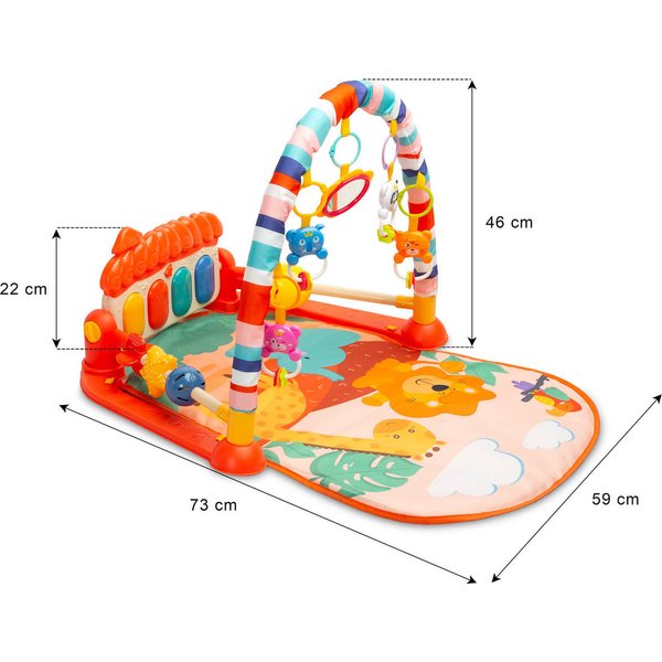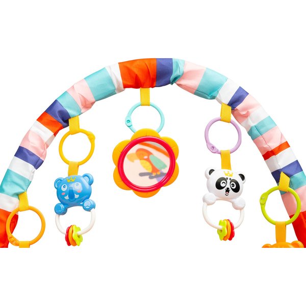 Edukacyjna Mata Zoo Toyz by Caretero to idealny produkt dla dzieci, które uwielbiają zabawę na leżąco. Mata jest wyposażona w pałąk z zawieszonymi na nim grzechotkami w kształcie przyjaznych zwierzątek oraz lusterkiem, które zachwyci maluszka. Multimedialny panel z dużymi przyciskami umili zabawę, a zabawki sensoryczne po bokach pomogą w rozwoju dziecka. Mata pomaga również w rozwoju koncentracji i uwagi dziecka. Jest odpowiednia dla dzieci już od pierwszych chwil życia. Dzięki przyjemnym melodiom i zestawowi grzechotek oraz lusterku, zabawa staje się jeszcze bardziej atrakcyjna.
