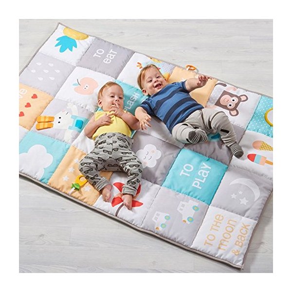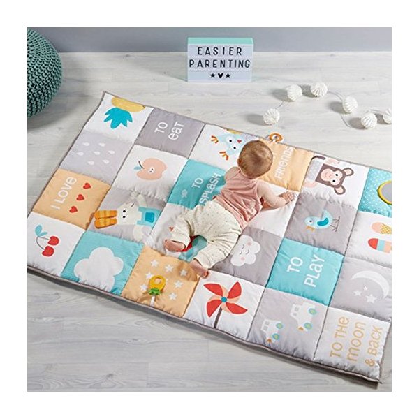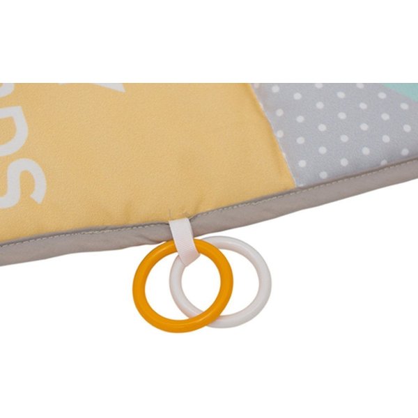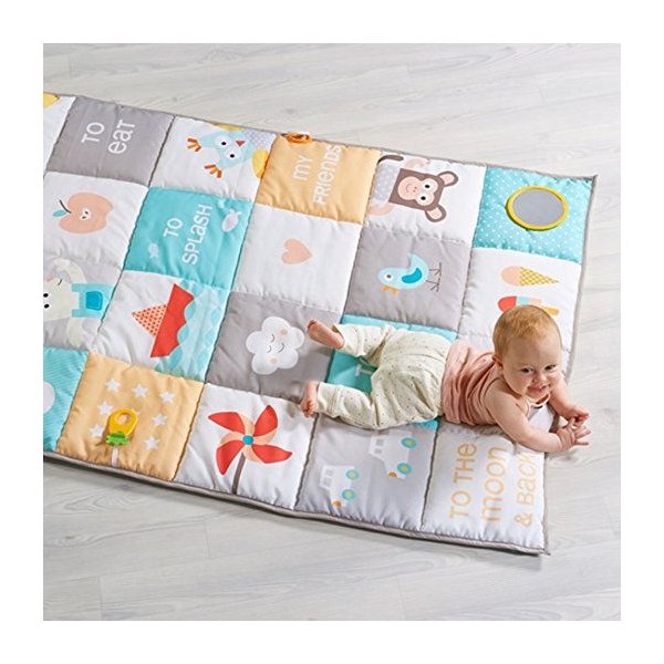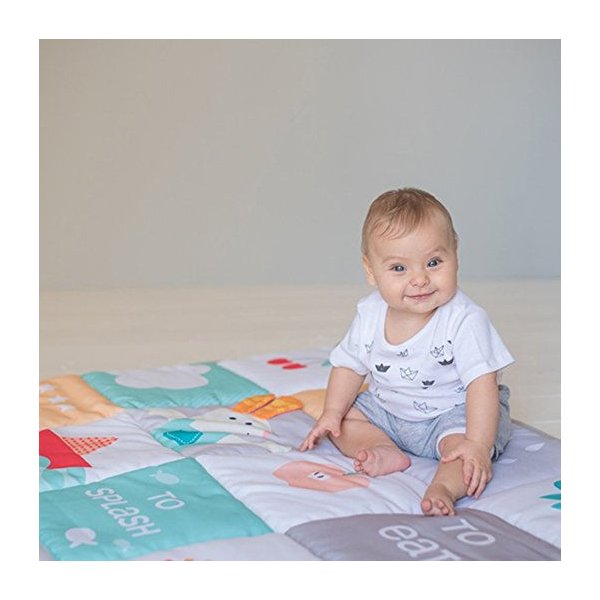 Mata to wspaniałe miejsce zabaw o wymiarach 100 cm na 150 cm! Bardzo mięciutkie wypełnienie maty zagwarantuje pełen komfort i bezpieczeństwo dla maluszka podczas zabawy. Cała mata przedstawia piękne ilustracje,które rozwiną u dziecka emocjonalną inteligencję, a zabawa z dzieckiem wzmocni relację i wieź rodzic-dziecko. Mata posiada odczepiane lusterko w pełni bezpieczne dla malucha, szeleszczące miejsca i gryzaczek.