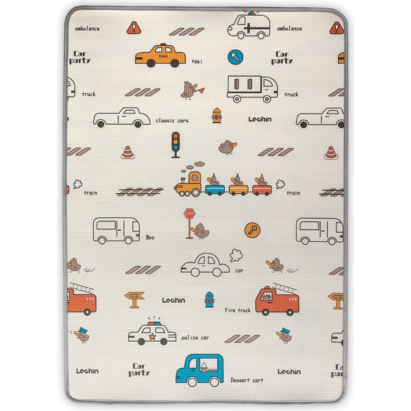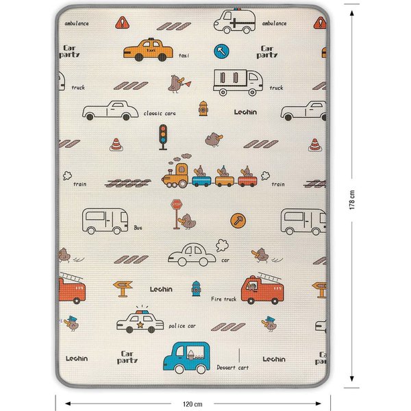 Mata jest dwustronna, dzięki czemu możesz ją zmieniać w zależności od tego, co aktualnie bardziej podoba się dziecku. Zapięcie na rzep umożliwi zwinięcie maty w rulon i zabranie jej w krótszą lub dłuższą podróż. Matę należy użytkować na płaskich powierzchniach w domu i w plenerze.